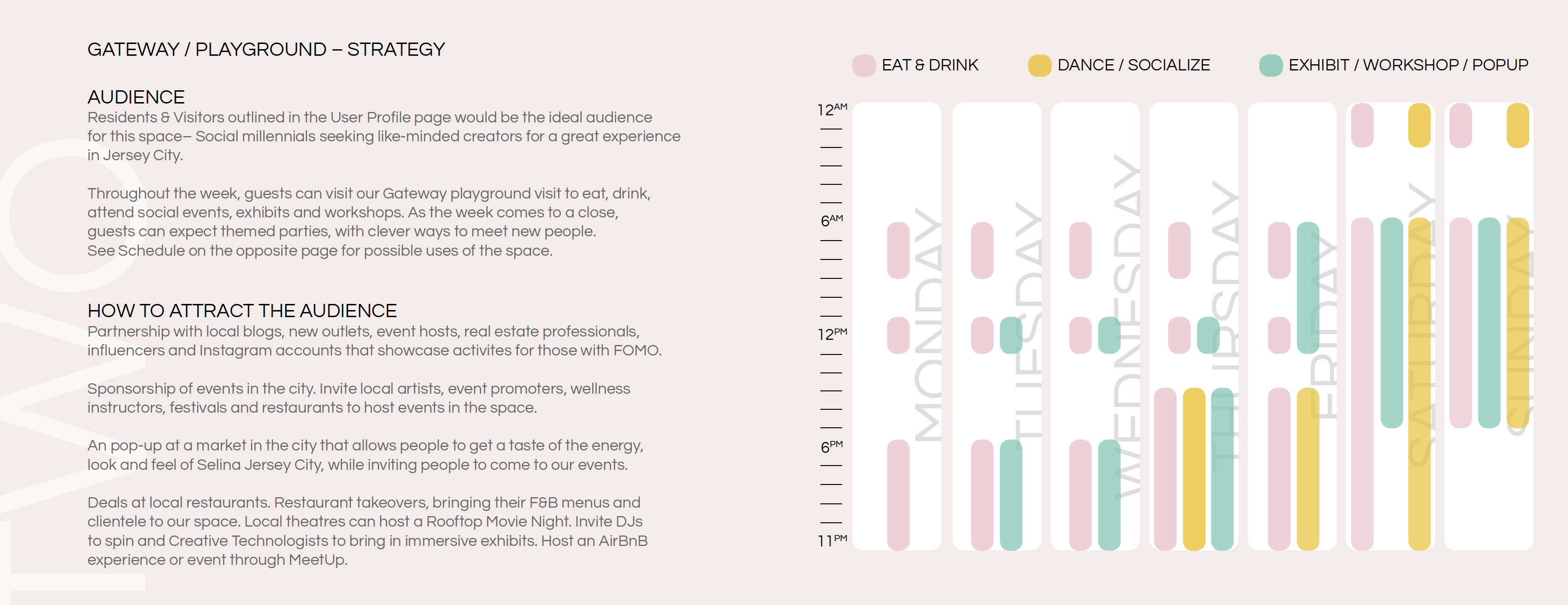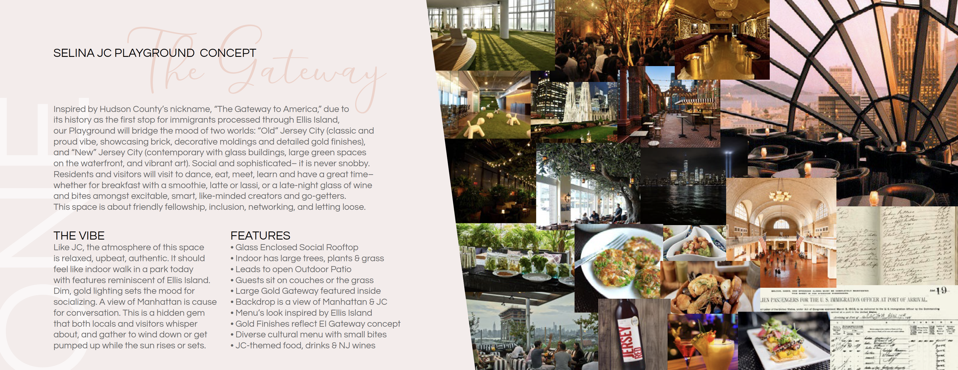 When Selina was still in its infancy, Cherisse was asked to create a comprehensive experience concept for a new location in Jersey City, New Jersey, dubbed "The Most Livable City in the US" at the time. Drawing inspiration from the county's nickname, "Gateway to America," Cherisse proposed "The Gateway" concept. Through analyzing the profiles of Jersey City residents and visitors, as well as the city's rapidly evolving art and restaurant scene, Cherisse envisioned a vibrant, sophisticated, and inclusive space catering to diverse young professionals who call both Jersey City and New York City home. The concept showcased strategies to attract visitors year-round through events centered around food, culture, dance, art, and social connections. Additionally, it outlined a multi-sensory experience, including art, architecture, and interior design, as well as partnership plans. Although Selina Jersey City didn't come to fruition, ideas from Cherisse's presentation were repurposed for the successful launch of Selina NYC and locations across the US.