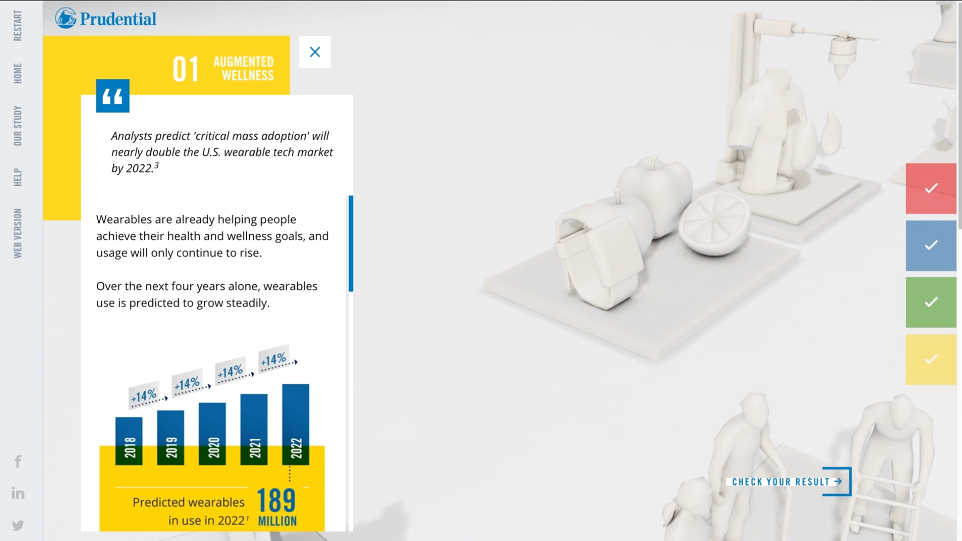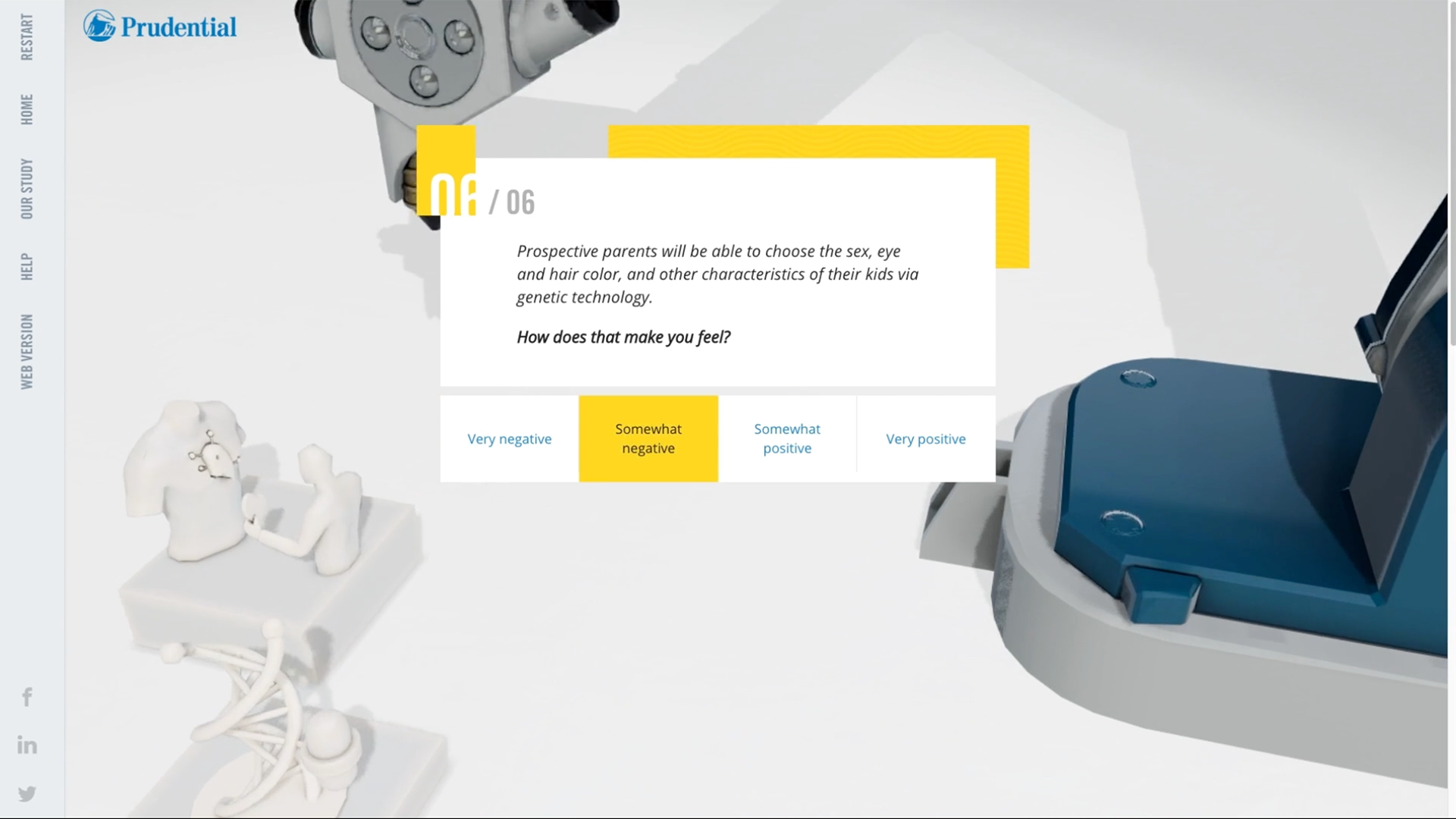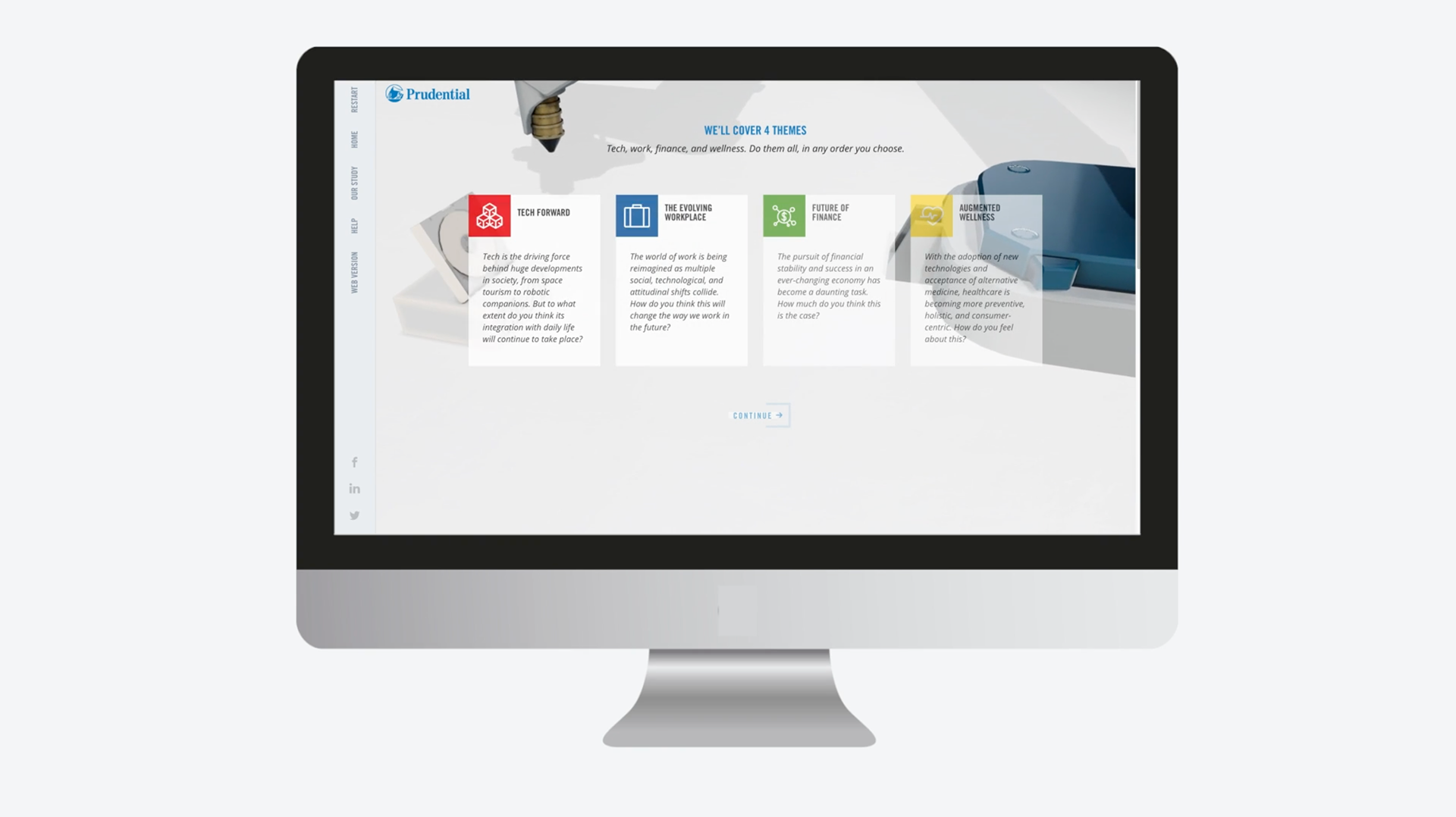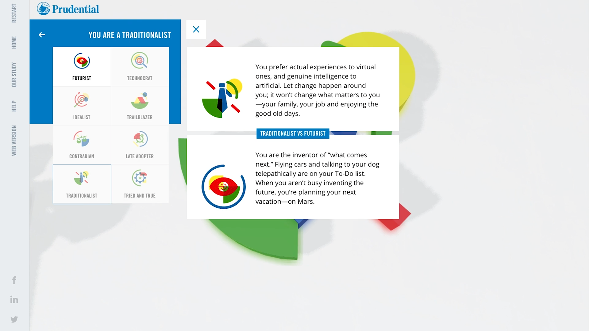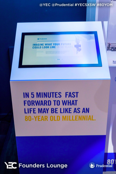 Prudential creatives teamed up with external partner Media Monks, to transform the study into an interactive aptitude test. Respondents' answers created a future timeline using a robotic 3-D arm, assigning 1 of 6 personalized persona tiles. This innovative experience made its debut at SXSW alongside Young Entrepreneur Council event, giving attendees a fun way to discover who their future self would be.