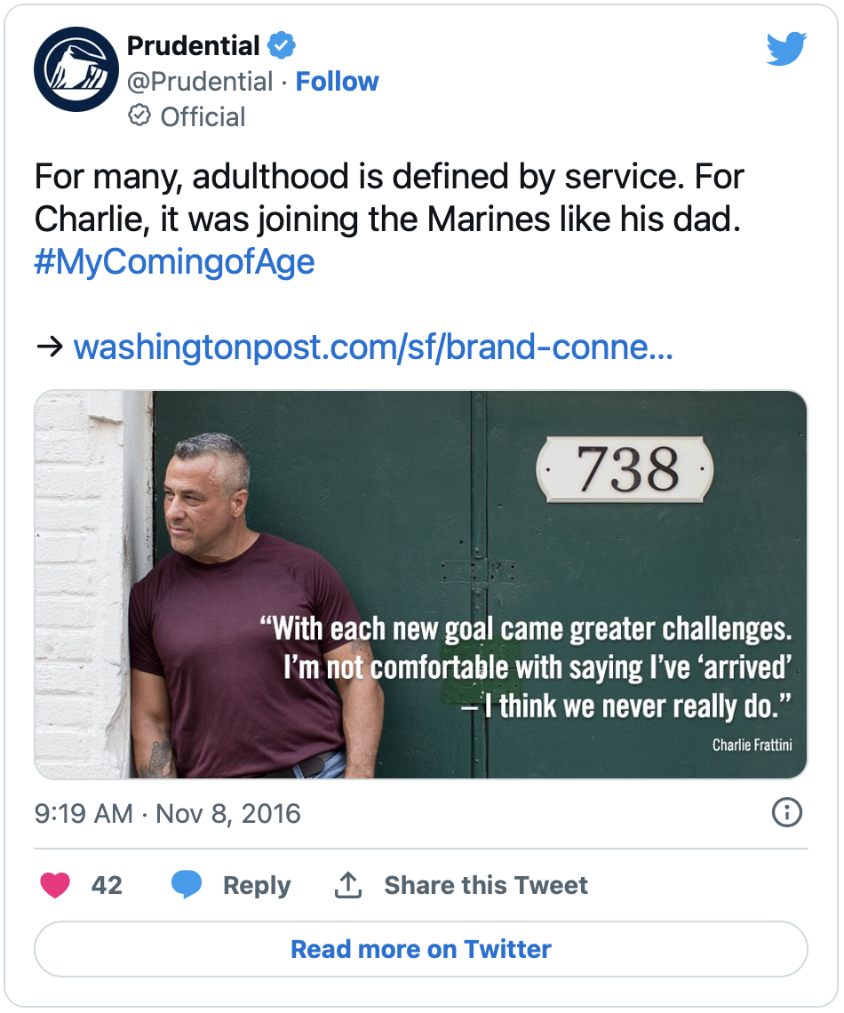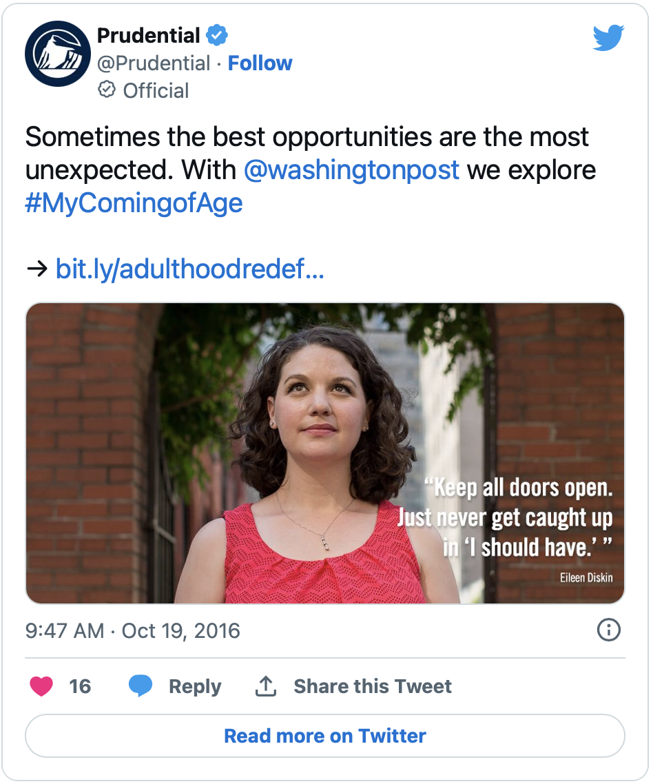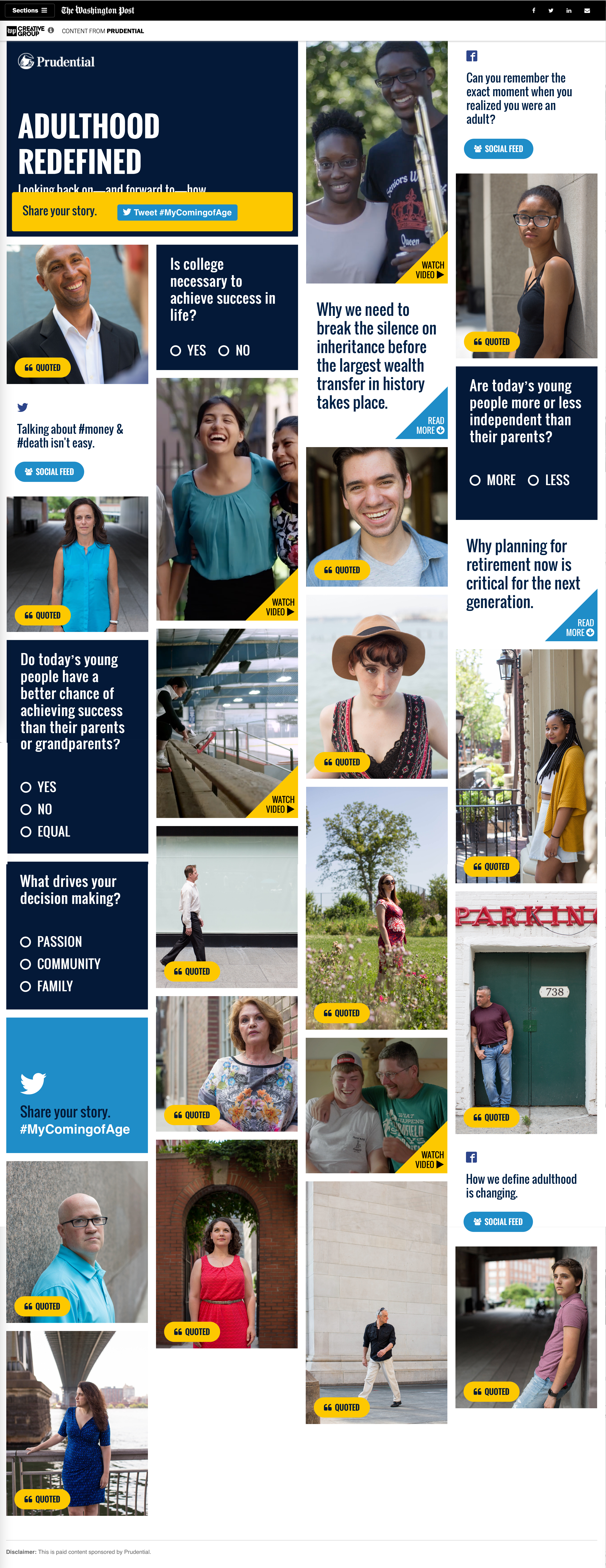 In partnership with The Washington Post, whose audience aligns with Prudential’s, we published the stories on a dedicated landing page. To amplify the campaign’s reach, we launched a comprehensive social and web campaign featuring clips, quotes, and questions connected to the videos. This encouraged engagement across all platforms, inviting Prudential’s audience to share their own #MyComingOfAge stories and experiences.